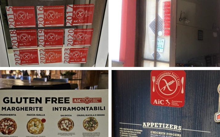 De coeliakievereniging in Italië heet AIC en staat voor "Associazione Italiana Celiachia". Herkenbaar aan hun rode logo. Die zou ik goed onthouden als je daar bent, want de kans is heel groot dat je die ergens ziet bij een restaurant, winkel of bakkerij bijvoorbeeld. Dit tref je dus niet alleen bij restaurants aan, maar ook hotels, pensions, vakantiehuizen, pretparken, pubs of wegrestaurants.