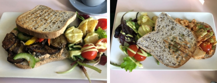 Op dag 3 gingen we wederom op dezelfde plek ontbijten. Dit keer bestelde mijn man ook een glutenvrij ontbijt, zodat we wederom, net als in Amsterdam, de broodjes met elkaar konden delen. We namen het brood met hummus en gegrilde groenten (zoals de dag ervoor) en we bestelden nu ook brood met gegrilde kip, harissa en een basilicumpesto. Beide broodjes smaakten heerlijk. Zoals je op de foto’s ziet, wordt het ontbijt geserveerd met een aardappelsalade. Delicious!