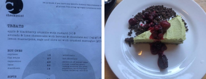 Na deze lange, intensieve wandeling besloten we om ergens koffie te drinken. We kwamen een plekje tegen met een glutenvrije avocadocheesecake, dus de keuze was vrij snel gemaakt. Dit restaurant heet Checkpoint en bevindt zich op Bristo 3 PI. Het is een gezellige tent met veel vegan en glutenvrije opties.