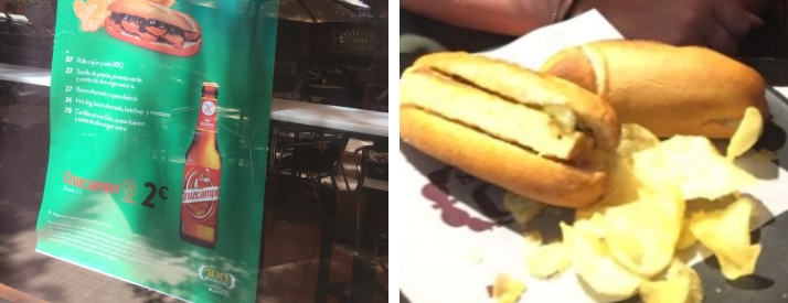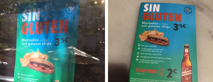Bleek er een glutenvrije lunchroom te zitten die er in eerste instantie al veel gezelliger uitzag. Daarnaast ben ik een echte broodliefhebber en sla ik nooit een kans over om lekker te lunchen met brood. Van binnen zag het er normaal uit, niet heel bijzonder, maar meer dan prima om even te zitten en bij te komen van het wandelen en warme weer. Ik liep direct naar de kassa toe om uiteraard eerst even te vragen hoe het precies zat met het eten en de bereiding daarvan. Ze sprak geen Engels, maar de communicatie liep prima gezien ik “sin gluten” zei en ze meteen begreep wat ik bedoelde. Er zaten een paar broodjes tussen die ik niet mocht hebben, maar voor de rest veel keuze tegen zeer lage prijzen. Voor een euro of twee heb je een heerlijk broodje. Alles werd verpakt geserveerd. Zo ben je er zeker van dat er niets bij kan komen!